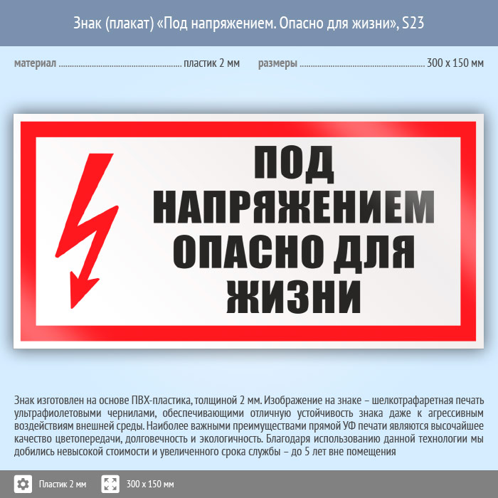 Знак (плакат) «Под напряжением. Опасно для жизни», S23 (пластик, 300х150 мм) в Черкесске купить