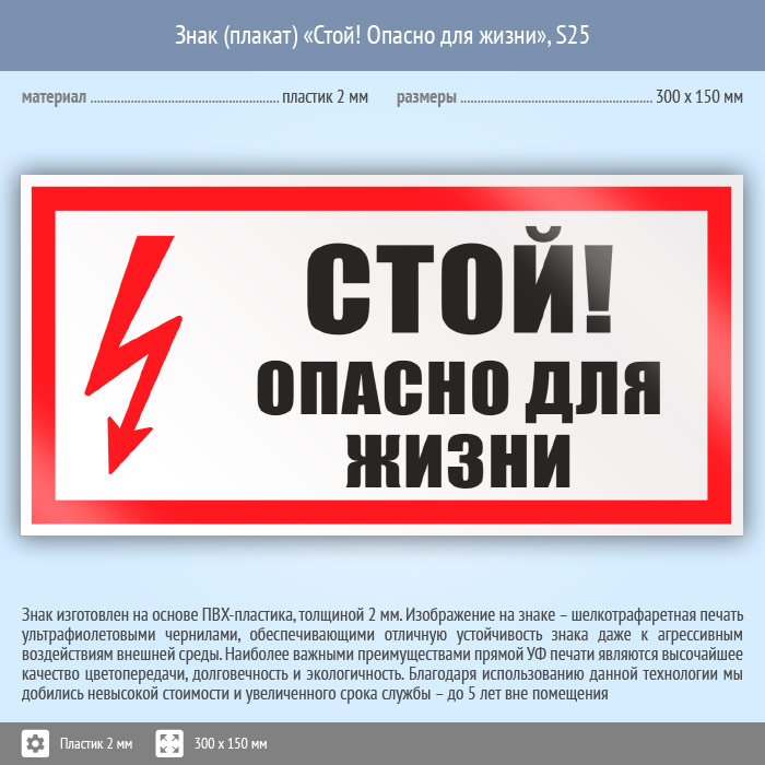 Знак (плакат) «Стой! Опасно для жизни», S25 (пластик, 300х150 мм) в Черкесске купить
