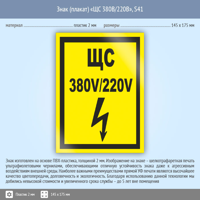 Знак (плакат) «ЩС 380В/220В», S41 (пластик, 145х175 мм) в Черкесске купить
