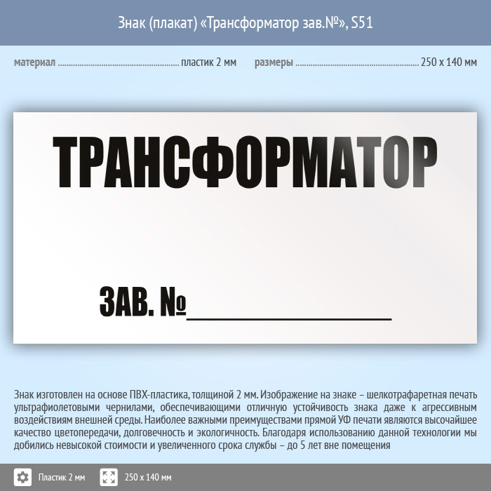 Знак (плакат) «Трансформатор зав.№», S51 (пластик, 250х140 мм) в Черкесске купить