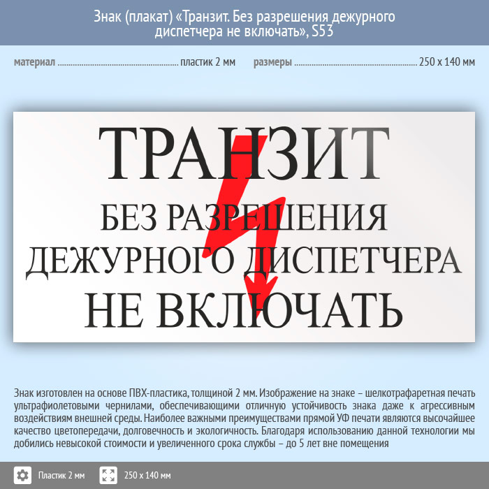 Знак (плакат) «Транзит. Без разрешения дежурного диспетчера Не включать», S53 (пластик, 250х140 мм) в Черкесске купить