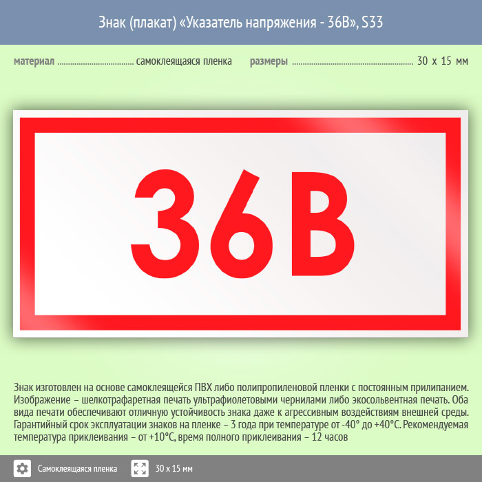 Знак (плакат) «Указатель напряжения - 36В», S33 (50 штук, пленка, 30х15 мм) в Черкесске купить