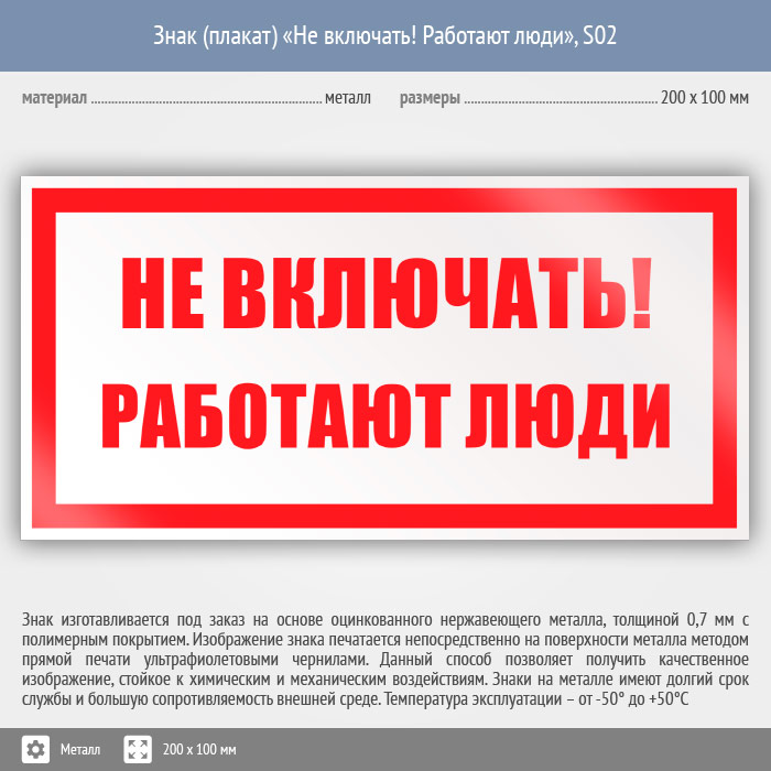 Знак (плакат) «Не включать! Работают люди», S02 (металл, 200х100 мм) в Черкесске купить