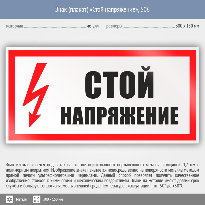 Знак (плакат) «Стой напряжение», S06 (металл, 300х150 мм) в Черкесске купить