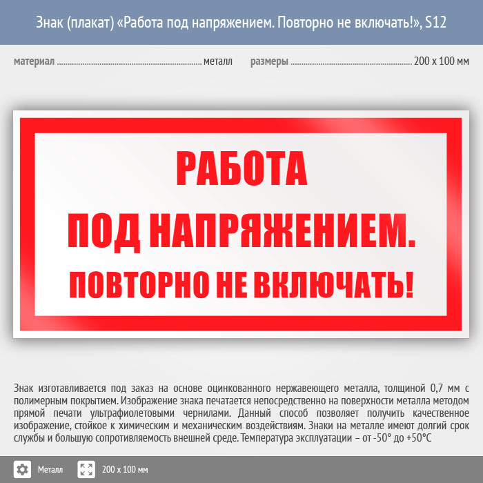 Знак (плакат) «Работа под напряжением. Повторно не включать!», S12 (металл, 200х100 мм) в Черкесске купить