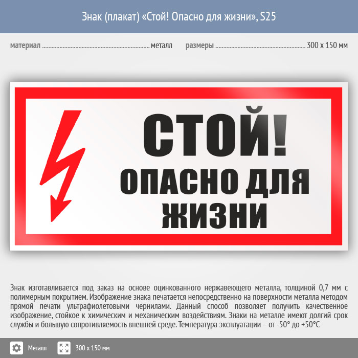 Знак (плакат) «Стой! Опасно для жизни», S25 (металл, 300х150 мм) в Черкесске купить