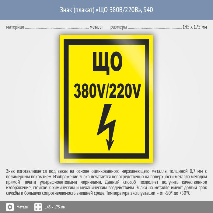 Знак (плакат) «ЩО 380В/220В», S40 (металл, 145х175 мм) в Черкесске купить