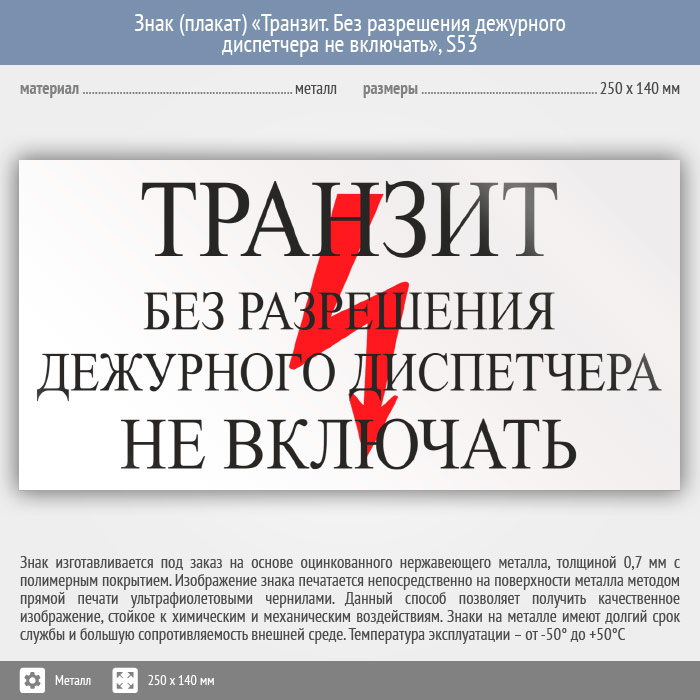 Знак (плакат) «Транзит. Без разрешения дежурного диспетчера Не включать», S53 (металл, 250х140 мм) в Черкесске купить