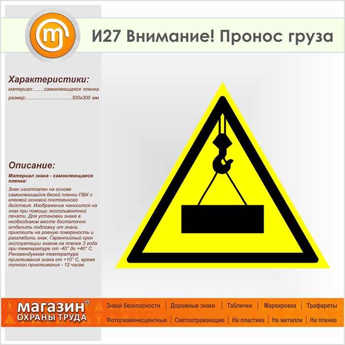 Знак «Внимание! Пронос груза», И27 (пленка, сторона 300 мм) в Черкесске купить