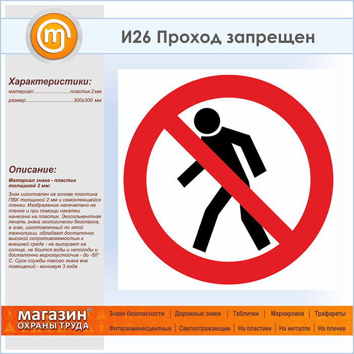 Знак «Проход запрещен», И26 (пластик, 300х300 мм) в Черкесске купить