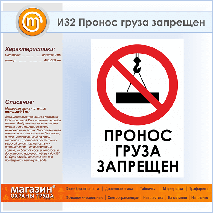 Знак «Пронос груза запрещен», И32 (пластик, 400х600 мм) в Черкесске купить