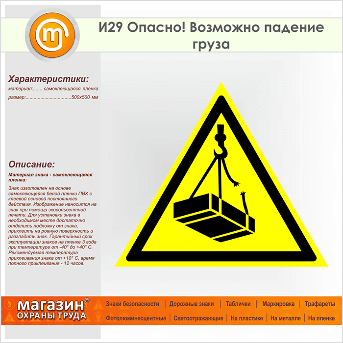 Знак «Опасно! Возможно падение груза», И29 (пленка, сторона 500 мм) в Черкесске купить