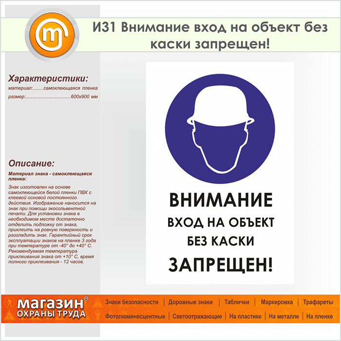 Знак «Внимание вход на объект без каски запрещен!», И31 (пленка, 600х900 мм) в Черкесске купить