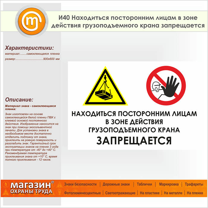 Знак «Находиться посторонним лицам в зоне действия грузоподъемного крана запрещается», И40 (пленка, 900х600 мм) в Черкесске купить