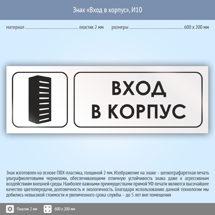 Знак «Вход в корпус», И10 (пластик, 600х200 мм) в Черкесске купить
