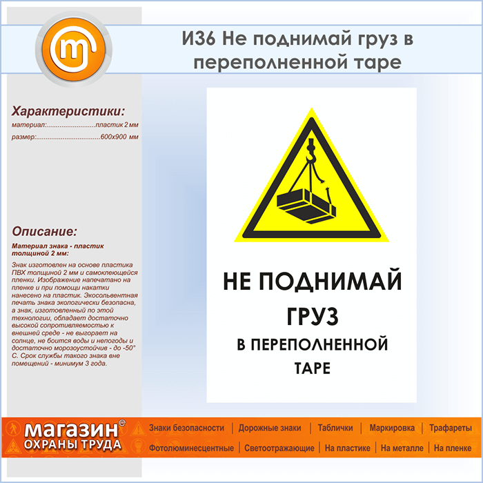 Знак «Не поднимай груз в переполненной таре», И36 (пластик, 600х900 мм) в Черкесске купить