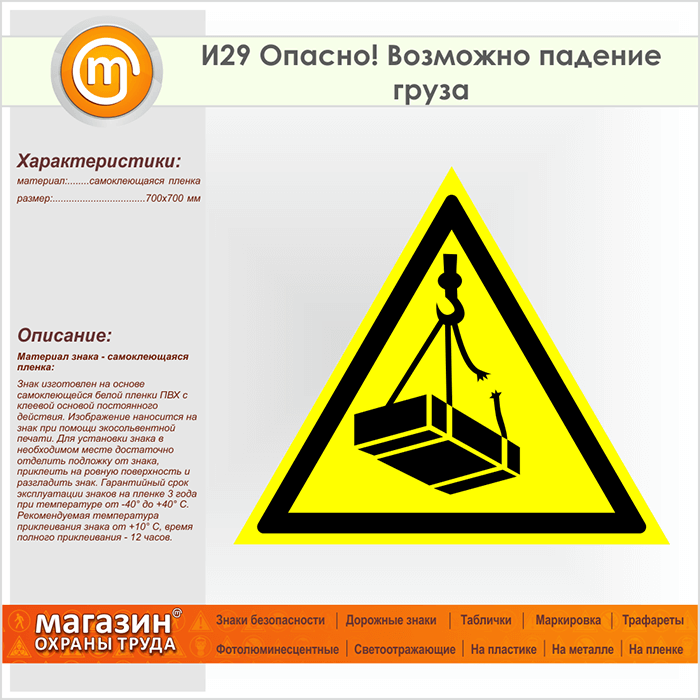 Знак «Опасно! Возможно падение груза», И29 (пленка, сторона 700 мм) в Черкесске купить