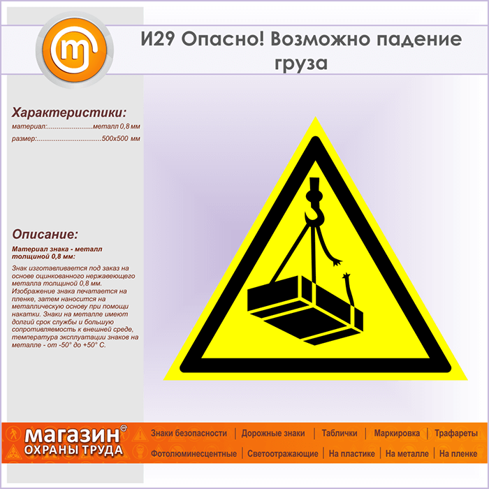 Знак «Опасно! Возможно падение груза», И29 (металл, сторона 500 мм) в Черкесске купить
