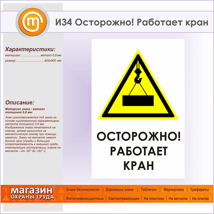 Знак «Осторожно! Работает кран», И34 (металл, 600х900 мм) в Черкесске купить