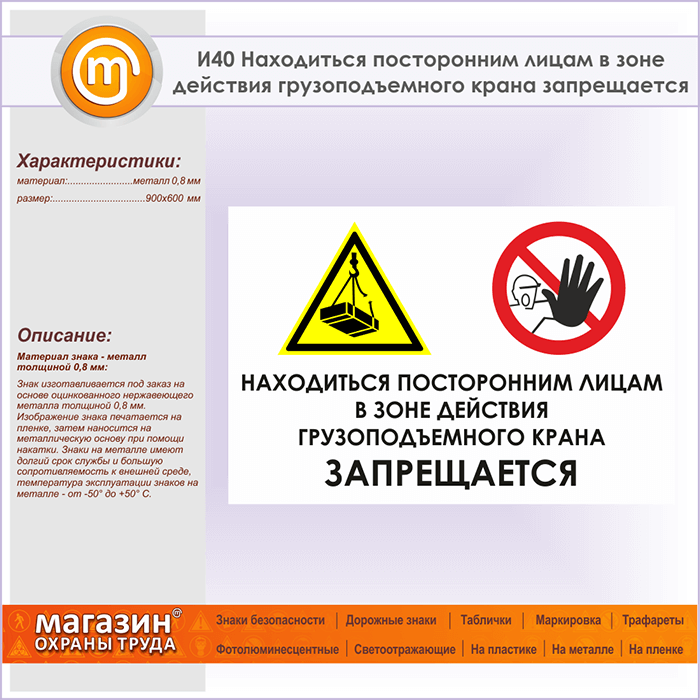 Знак «Находиться посторонним лицам в зоне действия грузоподъемного крана запрещается», И40 (металл, 900х600 мм) в Черкесске купить