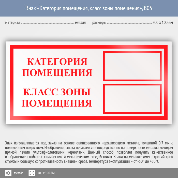 Знак «Категория помещения, класс зоны помещения», B05 (металл, 200х100 мм) в Черкесске купить