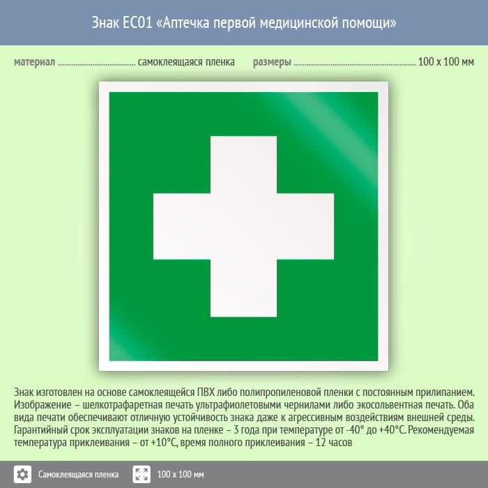 Знак EC01 «Аптечка первой медицинской помощи» (пленка, 100х100 мм) в Черкесске купить
