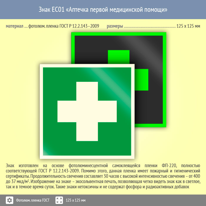 Знак EC01 «Аптечка первой медицинской помощи» (фотолюминесцентная пленка ГОСТ 34428-2018, 125х125 мм) в Черкесске купить