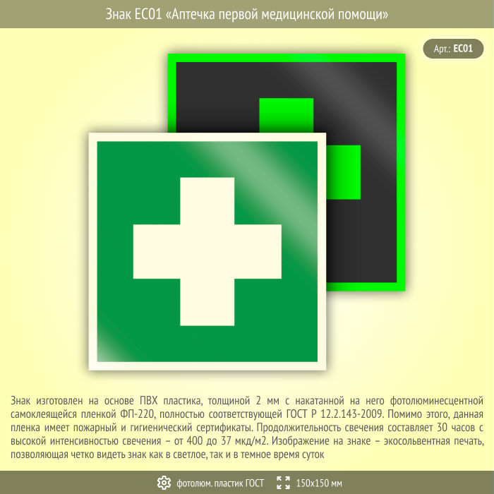 Знак EC01 «Аптечка первой медицинской помощи» (фотолюминесцентный пластик ГОСТ 34428-2018, 150х150 мм) в Черкесске купить