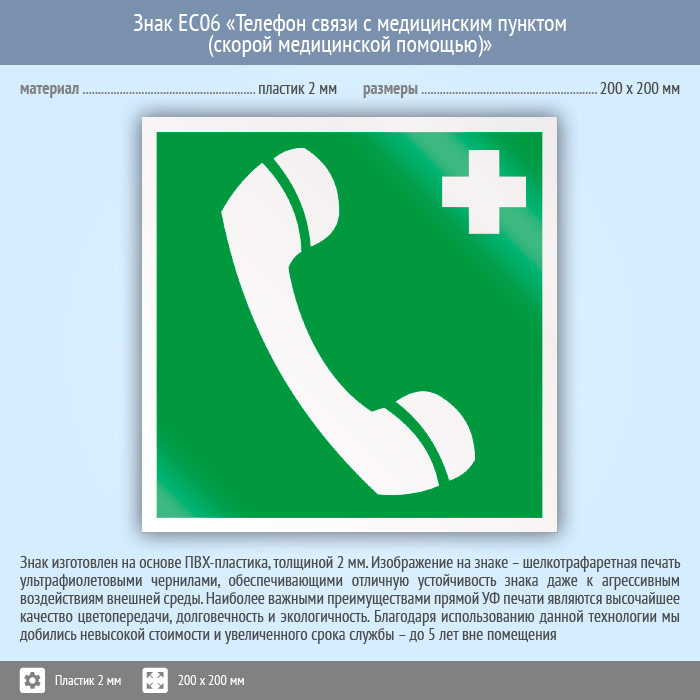Знак EC06 «Телефон связи с медицинским пунктом (скорой медицинской помощью)» (пластик, 200х200 мм) в Черкесске купить