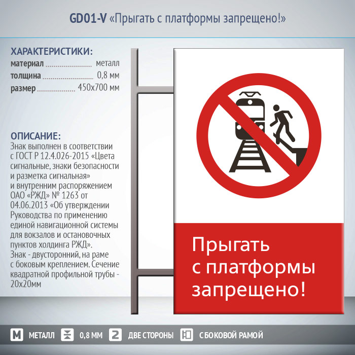 Знак «Прыгать с платформы запрещено!», GD01-V (двусторонний вертикальный, 450х700 мм, металл, на раме с боковым креплением) в Черкесске купить