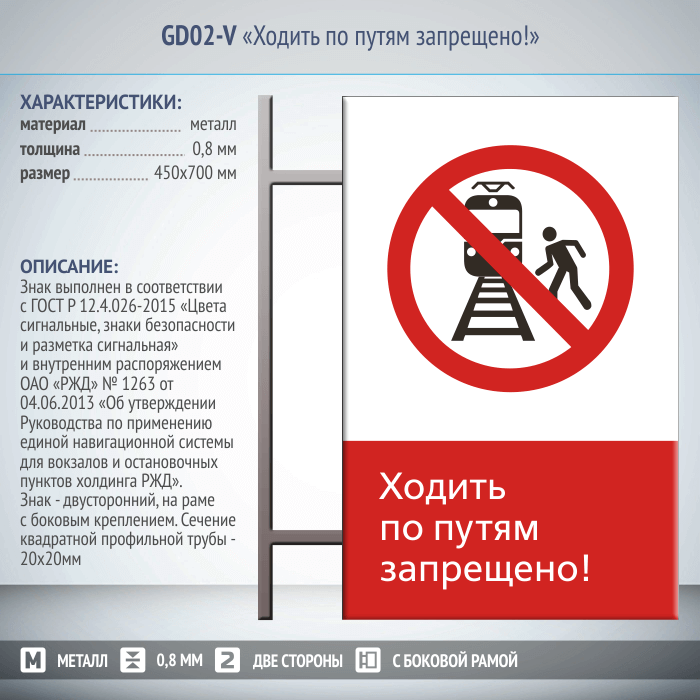 Знак «Ходить по путям запрещено!», GD02-V (двусторонний вертикальный, 450х700 мм, металл, на раме с боковым креплением) в Черкесске купить