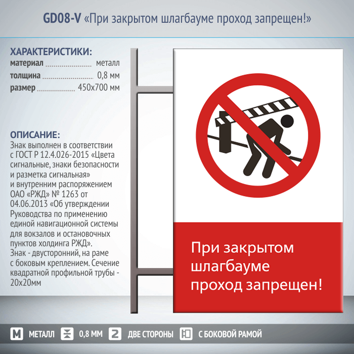 Знак «При закрытом шлагбауме проход запрещен!», GD08-V (двусторонний вертикальный, 450х700 мм, металл, на раме с боковым креплением) в Черкесске купить