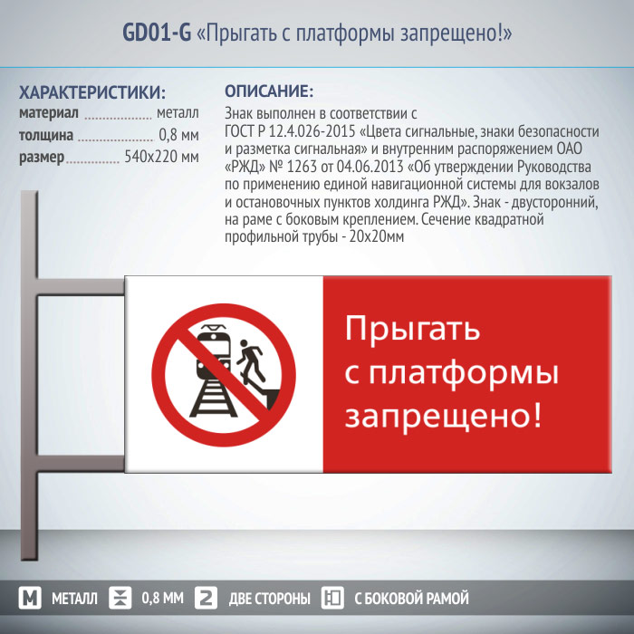 Знак «Прыгать с платформы запрещено!», GD01-G (двусторонний горизонтальный, 540х220 мм, металл, на раме с боковым креплением) в Черкесске купить