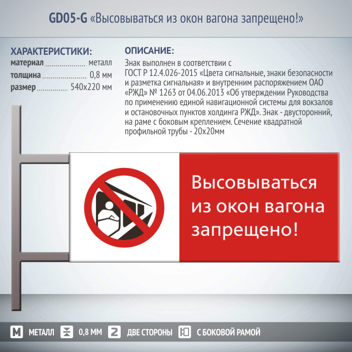 Знак «Высовываться из окон вагона запрещено!», GD05-G (двусторонний горизонтальный, 540х220 мм, металл, на раме с боковым креплением) в Черкесске купить