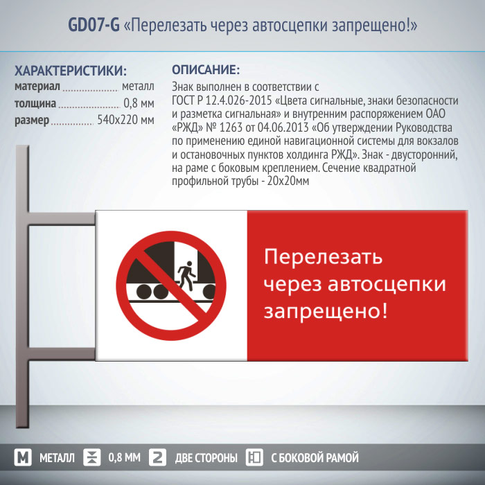 Знак «Перелезать через автосцепки запрещено!», GD07-G (двусторонний горизонтальный, 540х220 мм, металл, на раме с боковым креплением) в Черкесске купить
