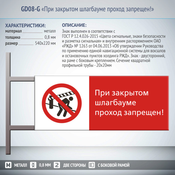 Знак «При закрытом шлагбауме проход запрещен!», GD08-G (двусторонний горизонтальный, 540х220 мм, металл, на раме с боковым креплением) в Черкесске купить