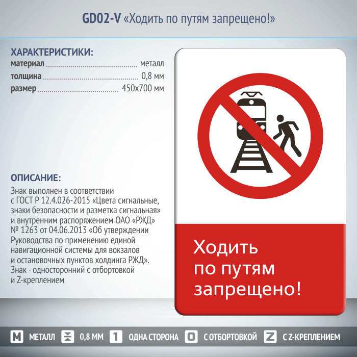 Знак «Ходить по путям запрещено!», GD02-V (односторонний вертикальный, 450х700 мм, металл, с отбортовкой и Z-креплением) в Черкесске купить