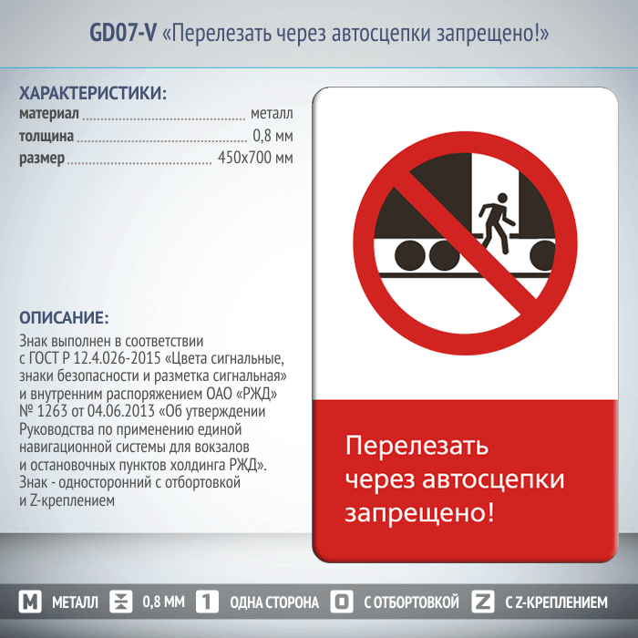 Знак «Перелезать через автосцепки запрещено!», GD07-V (односторонний вертикальный, 450х700 мм, металл, с отбортовкой и Z-креплением) в Черкесске купить