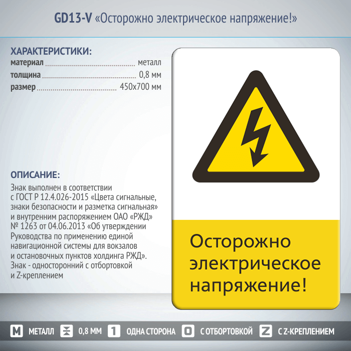 Знак «Осторожно электрическое напряжение!», GD13-V (односторонний вертикальный, 450х700 мм, металл, с отбортовкой и Z-креплением) в Черкесске купить