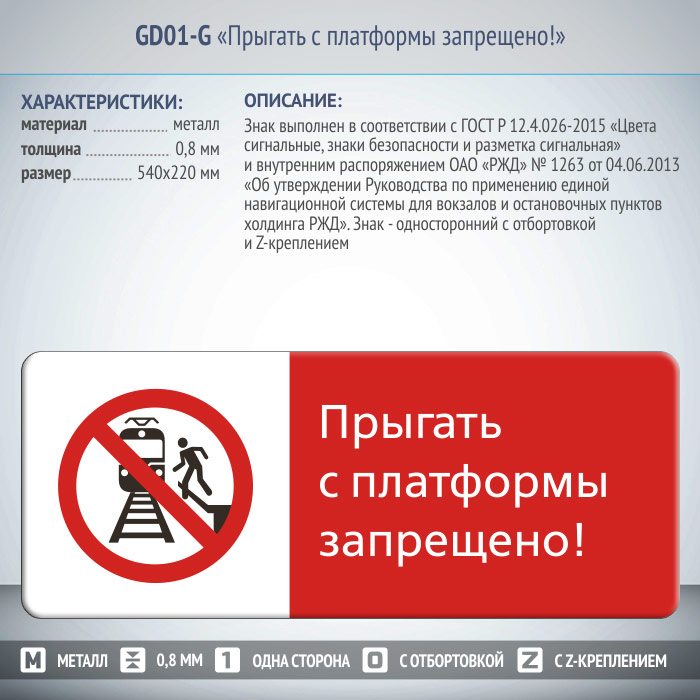 Знак «Прыгать с платформы запрещено!», GD01-G (односторонний горизонтальный, 540х220 мм, металл, с отбортовкой и Z-креплением) в Черкесске купить