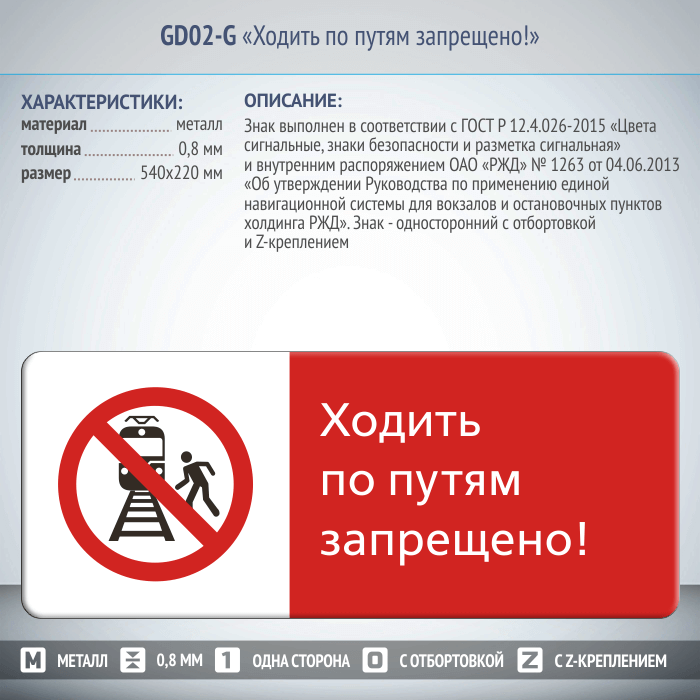 Знак «Ходить по путям запрещено!», GD02-G (односторонний горизонтальный, 540х220 мм, металл, с отбортовкой и Z-креплением) в Черкесске купить