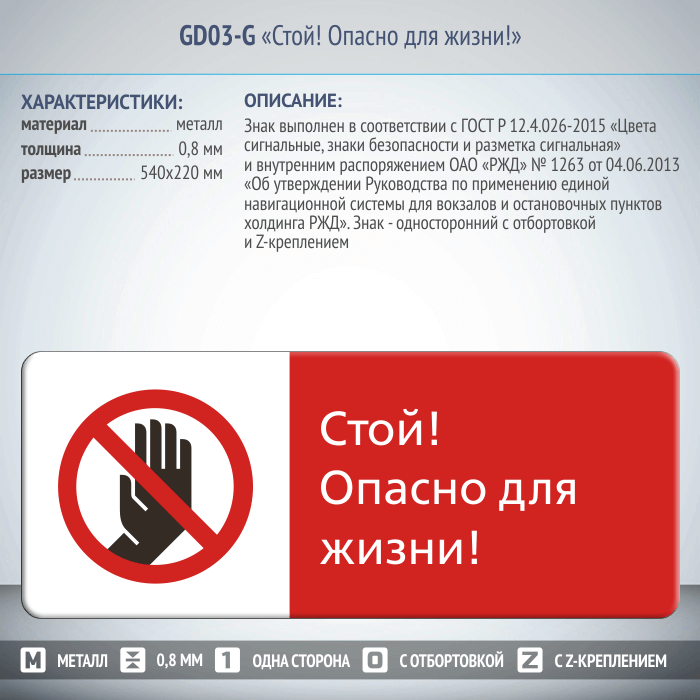 Знак «Стой! Опасно для жизни!», GD03-G (односторонний горизонтальный, 540х220 мм, металл, с отбортовкой и Z-креплением) в Черкесске купить