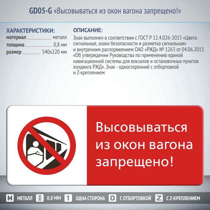 Знак «Высовываться из окон вагона запрещено!», GD05-G (односторонний горизонтальный, 540х220 мм, металл, с отбортовкой и Z-креплением) в Черкесске купить