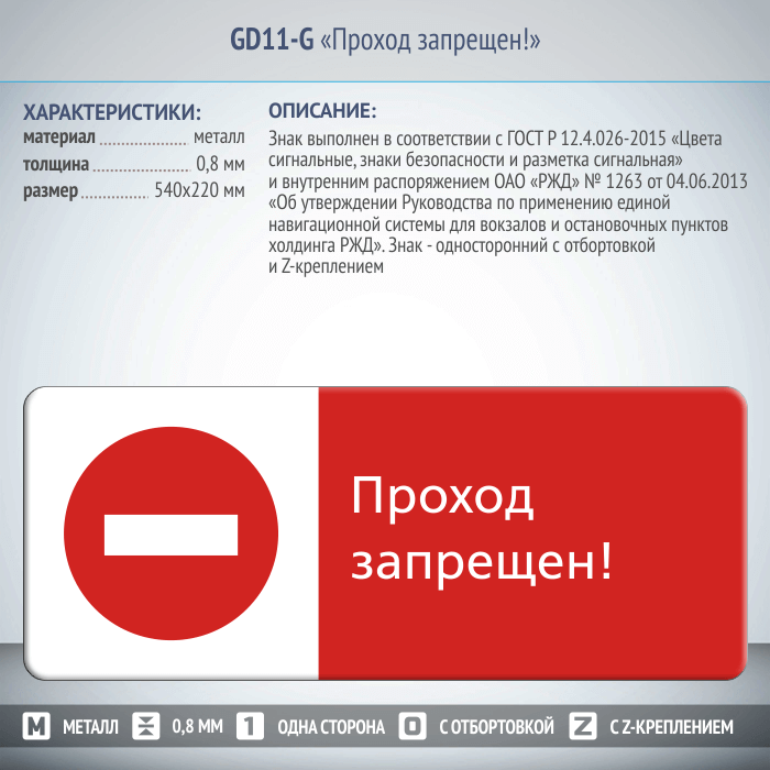 Знак «Проход запрещен!», GD11-G (односторонний горизонтальный, 540х220 мм, металл, с отбортовкой и Z-креплением) в Черкесске купить