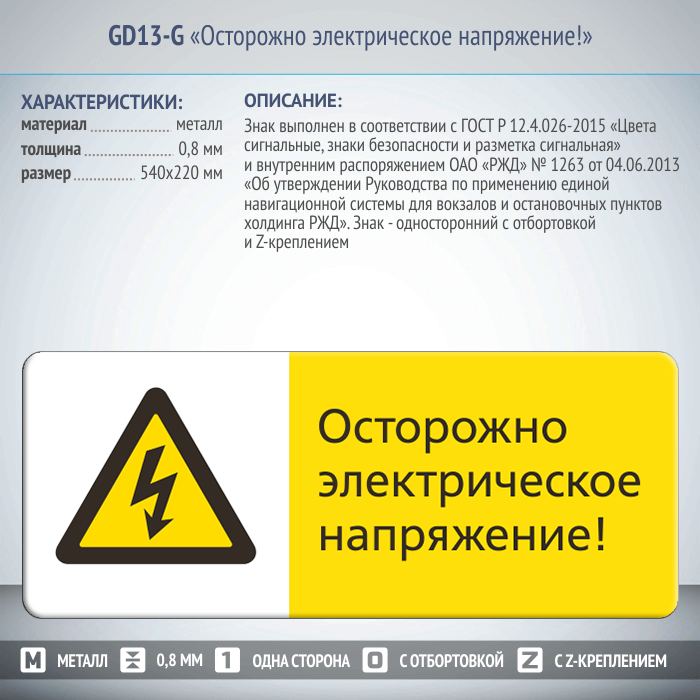 Знак «Осторожно электрическое напряжение!», GD13-G (односторонний горизонтальный, 540х220 мм, металл, с отбортовкой и Z-креплением) в Черкесске купить