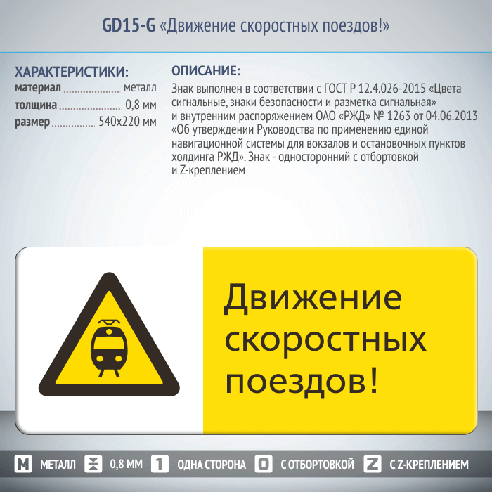 Знак «Движение скоростных поездов!», GD15-G (односторонний горизонтальный, 540х220 мм, металл, с отбортовкой и Z-креплением) в Черкесске купить