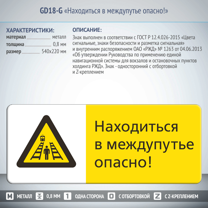 Знак «Находиться в междупутье опасно!», GD18-G (односторонний горизонтальный, 540х220 мм, металл, с отбортовкой и Z-креплением) в Черкесске купить