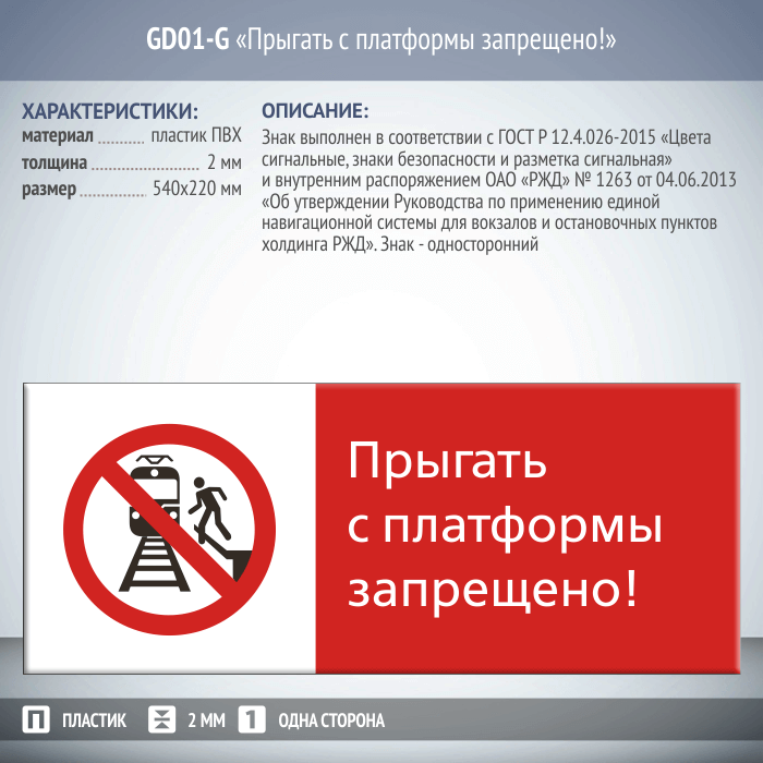 Знак «Прыгать с платформы запрещено!», GD01-G (односторонний горизонтальный, 540х220 мм, пластик 2 мм) в Черкесске купить