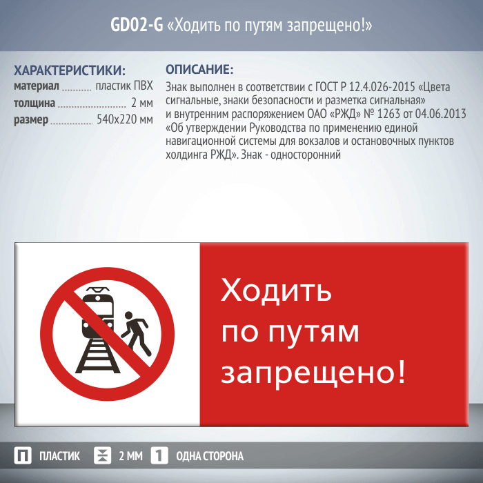 Знак «Ходить по путям запрещено!», GD02-G (односторонний горизонтальный, 540х220 мм, пластик 2 мм) в Черкесске купить