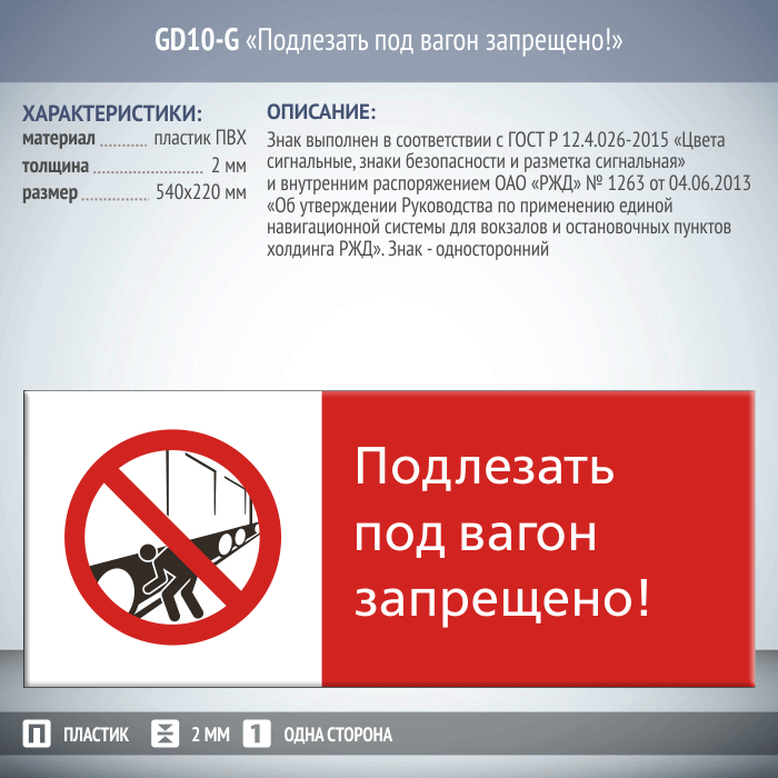 Знак «Подлезать под вагон запрещено!», GD10-G (односторонний горизонтальный, 540х220 мм, пластик 2 мм) в Черкесске купить